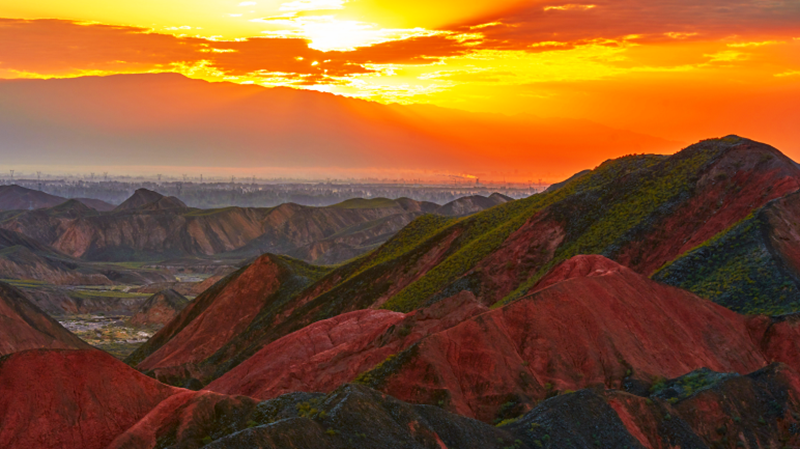 就在那一刹那,奇迹真真切切地发生了。那座山的峰顶,像是被一只看不见的手轻轻点了一下,忽然就活了过来——颜色活了!那是一种说不清道不明的赭红,浓得化不开,又亮得扎眼,带着地底下那股暖烘烘的劲儿,顺着山脊的褶子就往下淌。紧接着,旁边的山也跟着醒了:这边是沉甸甸的暗绛色,那边是泛着紫光的赫石色,再远些又跳出一抹明晃晃的橘黄……光在走,颜色就在跑、在混、在闹。刚才还铁青着脸、冷冰冰的一整片山峦,这会儿倒像个热闹极了的大乐团,光是那指挥家,色彩全是蹦跳的音符组成的。每一道山棱子,每一条沟坎儿,都在咿咿呀呀地唱着晨光里的调子。我边上老周举着相机愣在那儿,快门都忘了按,嘴里嘟囔着:“这颜色……唉,《千里江山图》里最浓的那一笔青绿怕也调不出来吧。”