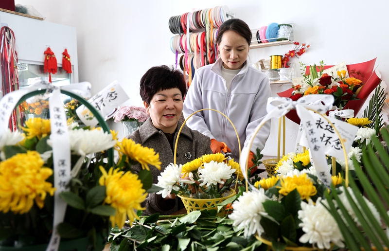 与此同时,在县城中心的一家鲜花店内,店主刘红正忙得不可开交。店里店外摆满了黄白菊花,淡淡的花香氤氲在空气中。她一边娴熟地修剪花枝、打包花束,一边热情地招呼着进店的顾客。