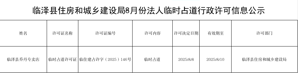 临泽县住房和城乡建设局8月份法人临时占道行政许可信息公示