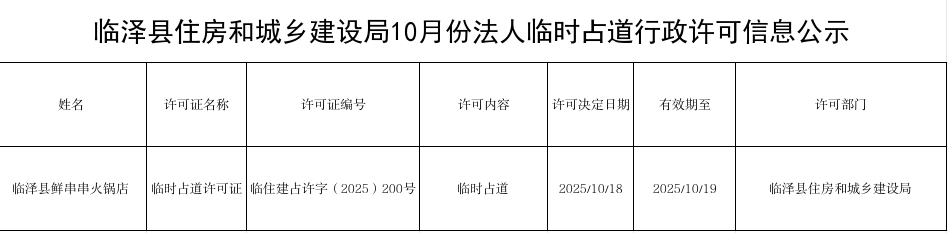 临泽县住房和城乡建设局10月份法人临时占道行政许可信息公示