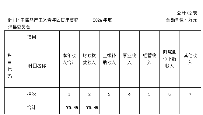 2024年度收入合计70.46万元,其中:财政拨款收入70.46万元,占100.00%;上级补助收入0.00万元,占0.00%;事业收入0.00万元,占0.00%;经营收入0.00万元,占0.00%;附属单位上缴收入0.00万元,占0.00%;其他收入0.00万元,占0.00%;