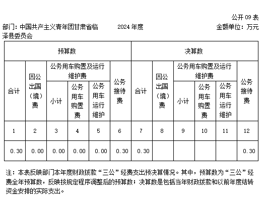 2024年度“三公”经费支出全年预算数为0.30万元,支出决算为0.30万元,决算数等于预算数。较上年决算数增加0.09万元,增长41.33%,增长的主要原因是我单位2024年举办全县“青马工程”团队干部培训班,产生培训费用。