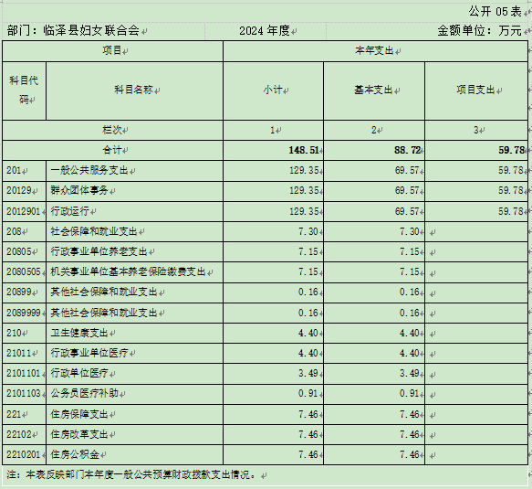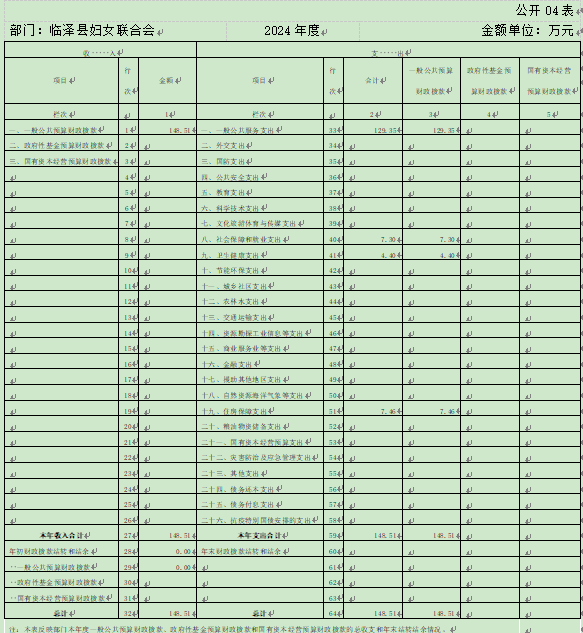 2024年度财政拨款收、支总计均为148.51万元。与上年相比,各增加22.87万元,增长18.20%。主要原因是2024年县委县政府为民办实事为临泽户籍35-64周岁妇女购买“两癌”保险的收入380000元,支出292840。2024年人员工资社保费用福利等支出666560.62元。