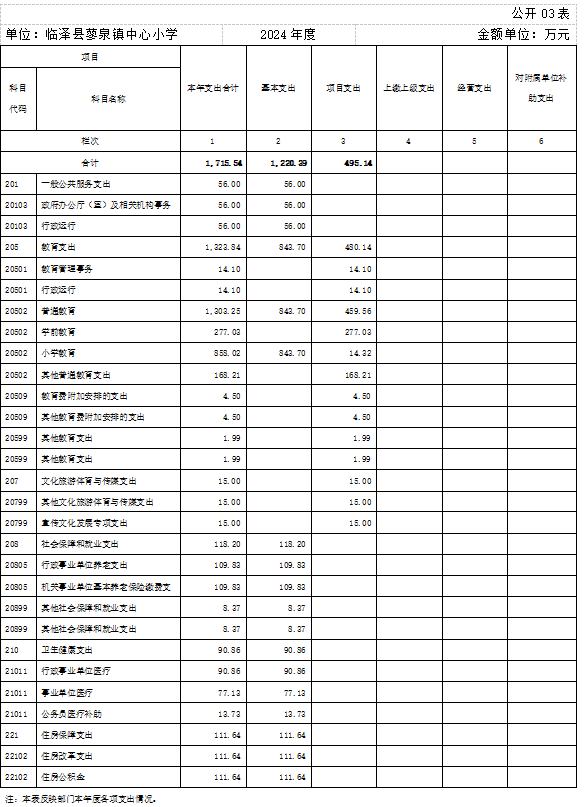 2024年度支出合计1715.54万元,其中:基本支出1220.39万元,占71.14%;项目支出495.14万元,占28.86%;上缴上级支出0.00万元,占0.00%;经营支出0.00万元,占0.00%;对附属单位补助支出0.00万元,占0.00%。