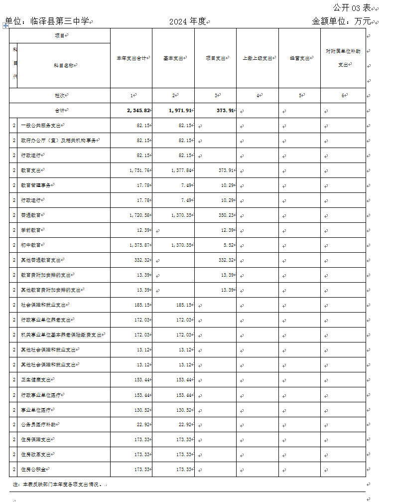 2.教育支出年初预算数为1534.29万元,支出决算为1722.44万元,完成年初预算的112.26%,决算数大于预算数的主要原因是学校公用经费等是上级转移支付资金,年初由临泽县教育局统一预算。