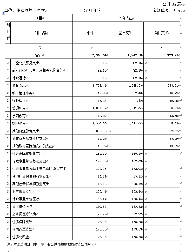2024年度一般公共预算财政拨款支出2316.51万元,主要用于以下方面:一般公共服务支出82.15万元,占3.55%;教育支出1722.44万元,占74.36%;社会保障和就业支出185.15万元,占7.99%;卫生健康支出153.44万元,占6.62%;住房保障支出173.33万元,占7.48%。