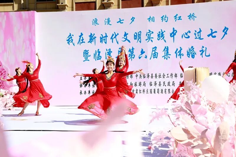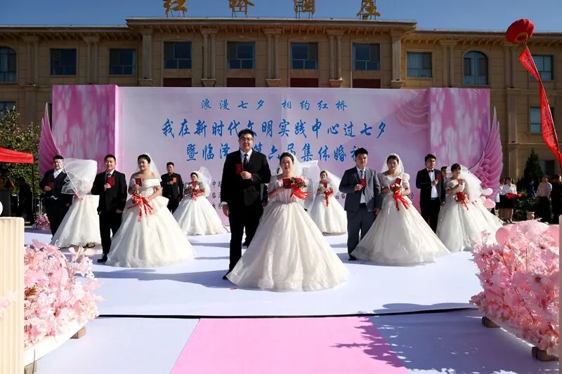 8月29日上午,临泽县“我在新时代文明实践中心过七夕”集中示范活动在板桥镇红桥庄园举行,10对新人、1对金婚夫妇、1对银婚夫妇在亲友和现场群众的见证下,以简约而不失庄重的集体婚礼仪式喜结连理,共同倡导文明婚俗新风尚。