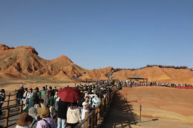 “为迎接2025年‘十一’黄金周,张掖七彩丹霞旅游景区积极筹备,提前制定了《2025年国庆假期运营方案》和应急预案,依托大数据平台进行科学研判,动态调度人力、物力和设施设备,全力提升运营效率。在提升游客体验方面,我们增加了观光车辆的运营频次,加强巡逻与实时监控,同时优化服务流程,丰富产品供给,力求为游客提供更加优质、便捷、高效的服务。也欢迎广大游客‘十一’期间前来游览!”张掖七彩丹霞景区工作人员刘思思说。