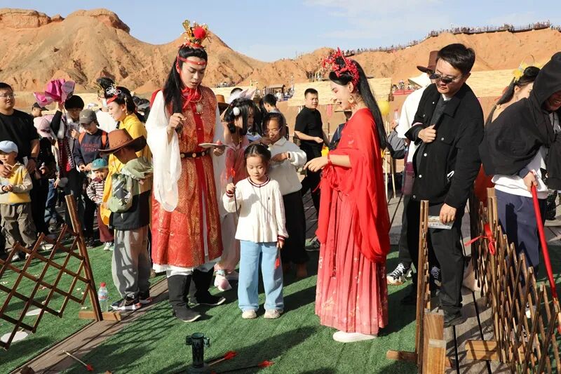 为丰富游客体验,国庆中秋假期期间,张掖七彩丹霞景区全天候运营直升机、热气球、动力滑翔伞、全地形越野车、乘驼观光等项目,为游客带来多层次、沉浸式的游览体验。同时,景区推出“丹霞织锦 礼乐寻游”系列文化活动,快闪、国风T台秀、古装互动等项目也吸引大量游客参与。