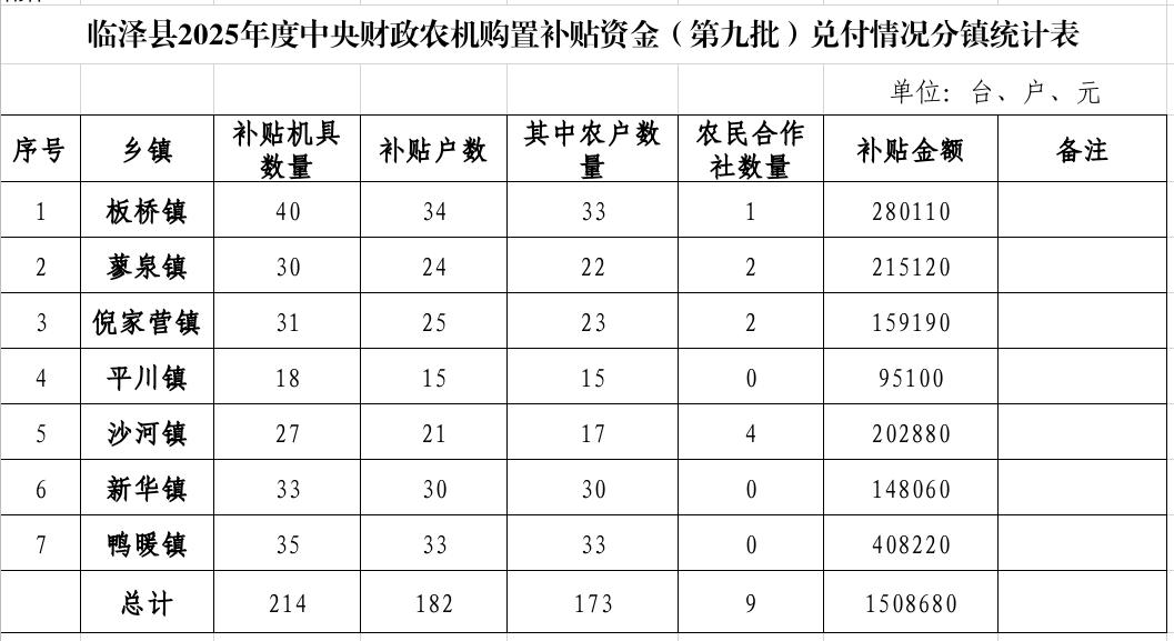 附件:临泽县2025年度中央财政农机购置补贴资金(第九批)兑付情况分镇统计表