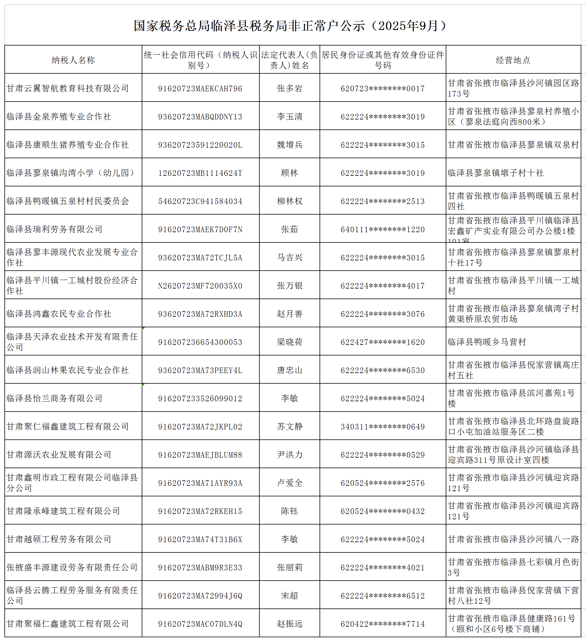 国家税务总局临泽县税务局非正常户公示(2025年9月)