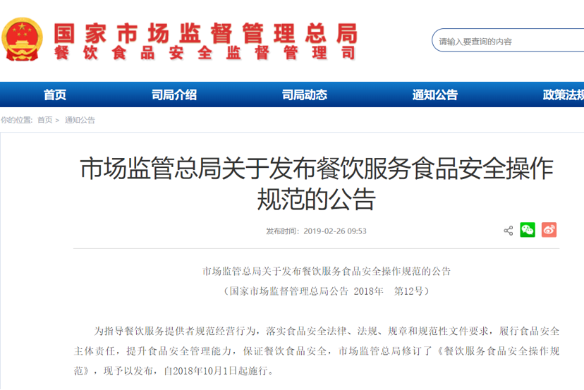 6.《市场监管总局关于发布餐饮服务食品安全操作规范的公告》(国家市场监督管理总局公告2018年第12号)2018年6月22日公布,2018年10月1日起施行