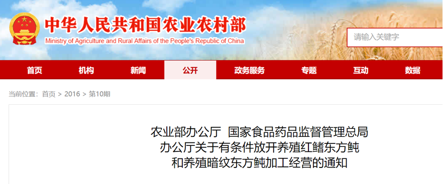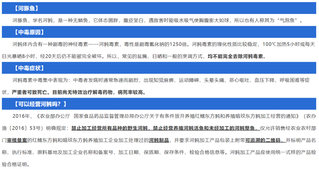 《农业部办公厅  国家食品药品监督管理总局办公厅关于有条件放开养殖红鳍东方鲀和养殖暗纹东方鲀加工经营的通知》(农办渔〔2016〕53号):禁止销售、加工经营养殖河鲀活鱼、未经加工的河鲀整鱼及所有品种的野生河鲀,仅允许经营农业农村部批准的养殖河鲀(养殖红鳍东方鲀和养殖暗纹东方鲀)加工企业加工的、带包装的河鲀加工产品。包装上应附带可追溯二维码、产品名称、执行标准、原料基地及加工企业名称和备案号、加工日期、保质期、保存条件、检验合格信息等。