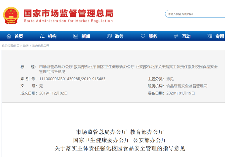 7.《市场监管总局办公厅教育部办公厅国家卫生健康委办公厅公安部办公厅关于落实主体责任强化校园食品安全管理的指导意见》(市监食经〔2019〕68号)2019年12月2日