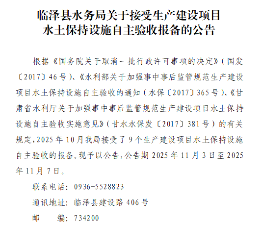 临泽县水务局关于接受生产建设项目 水土保持设施自主验收报备的公告