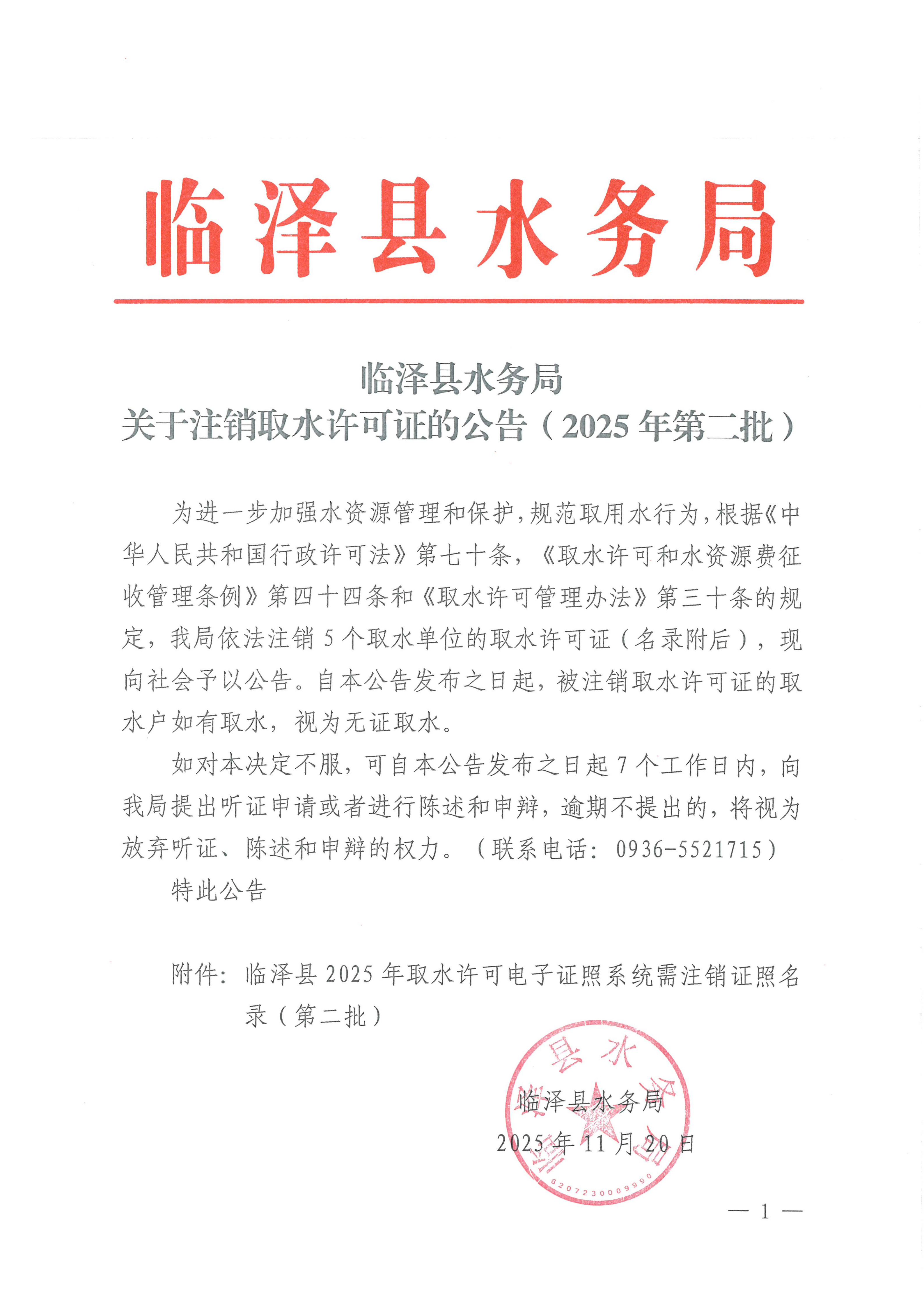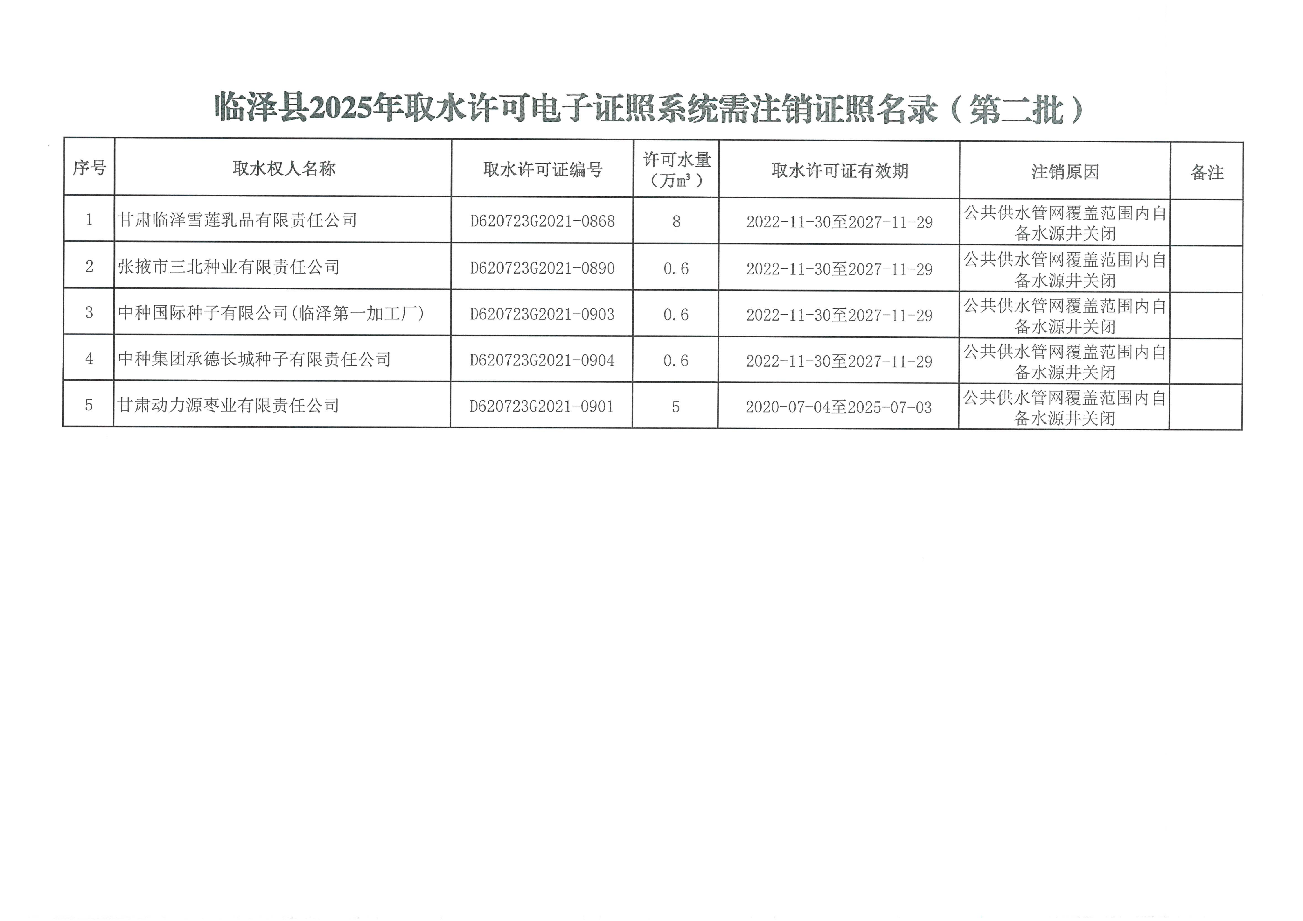临泽县水务局关于注销取水许可证的公告(2025年第二批)