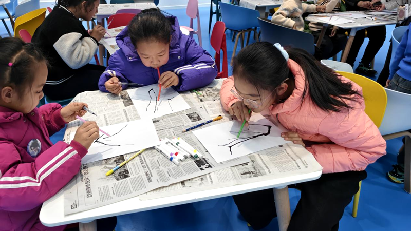 讲解结束后,“梅花画九”动手体验环节随即开启。科普辅导员首先为大家讲解“画九”习俗的由来:古代先民以冬至为计时起点,绘制九朵梅花,每日涂染一朵花瓣,待九九八十一天画满,便迎来春暖花开。这一习俗既寄托着人们对春日的殷切期盼,也是古人观测气候、感知时节变迁的独特智慧结晶。随后,现场亲子家庭依次领取空白梅花画纸与彩色画笔,大人孩子默契配合、尽情挥洒创意。大家或为梅花点缀冬日雪景,或融入饺子、灯笼等冬至元素,一幅幅作品生动鲜活,尽显传统文化的深厚底蕴。