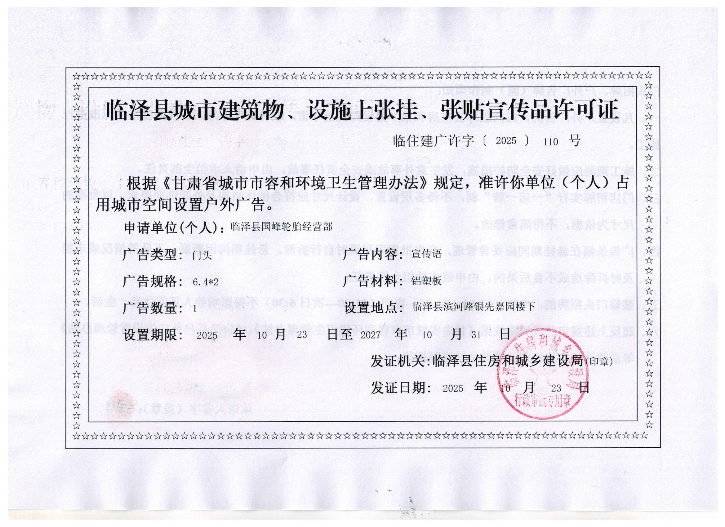 临泽县城管执法队对临泽县国峰轮胎经营部户外广告的许可证