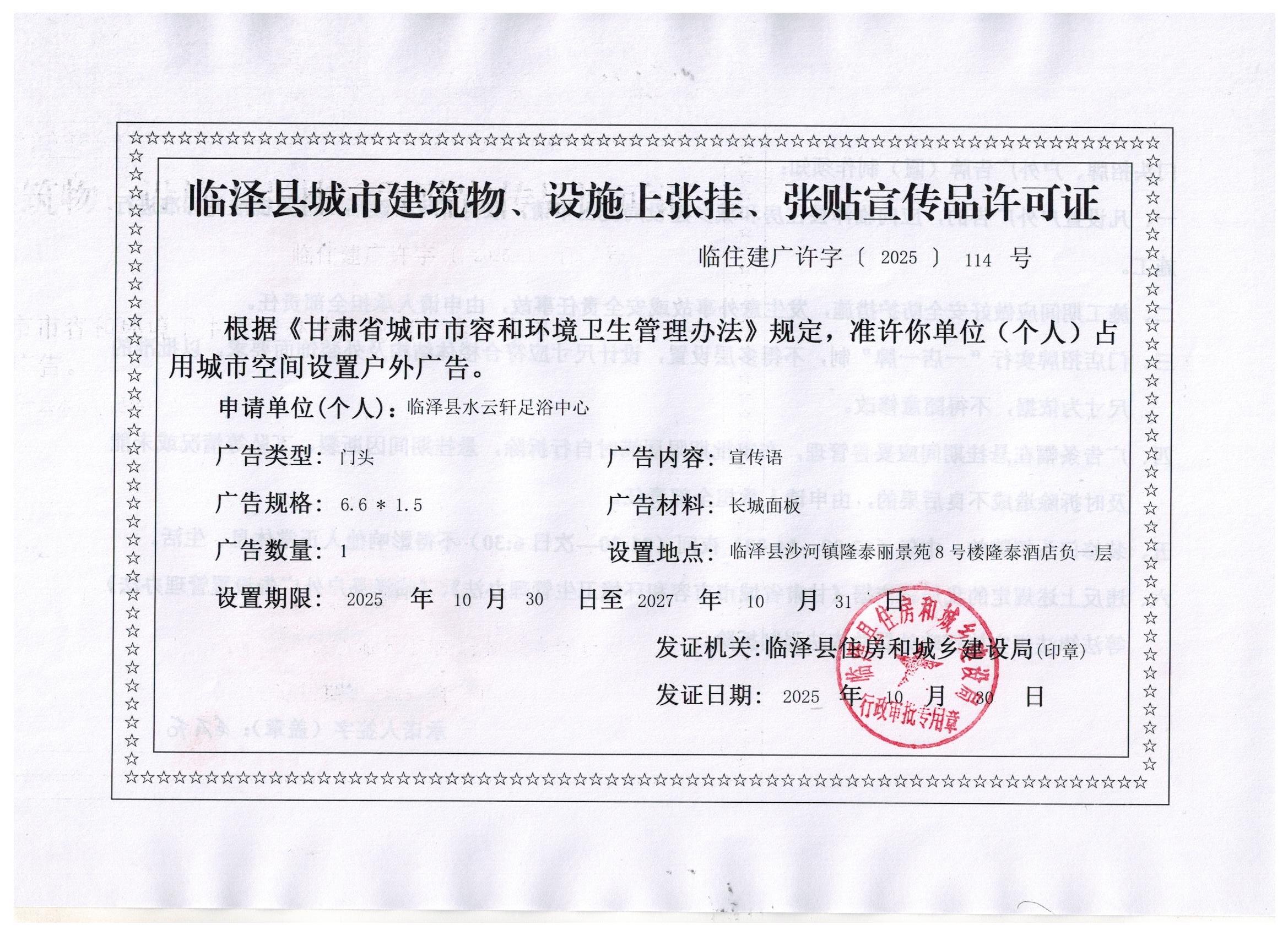 临泽县城管执法队对临泽县水云轩足浴中心户外广告的许可证