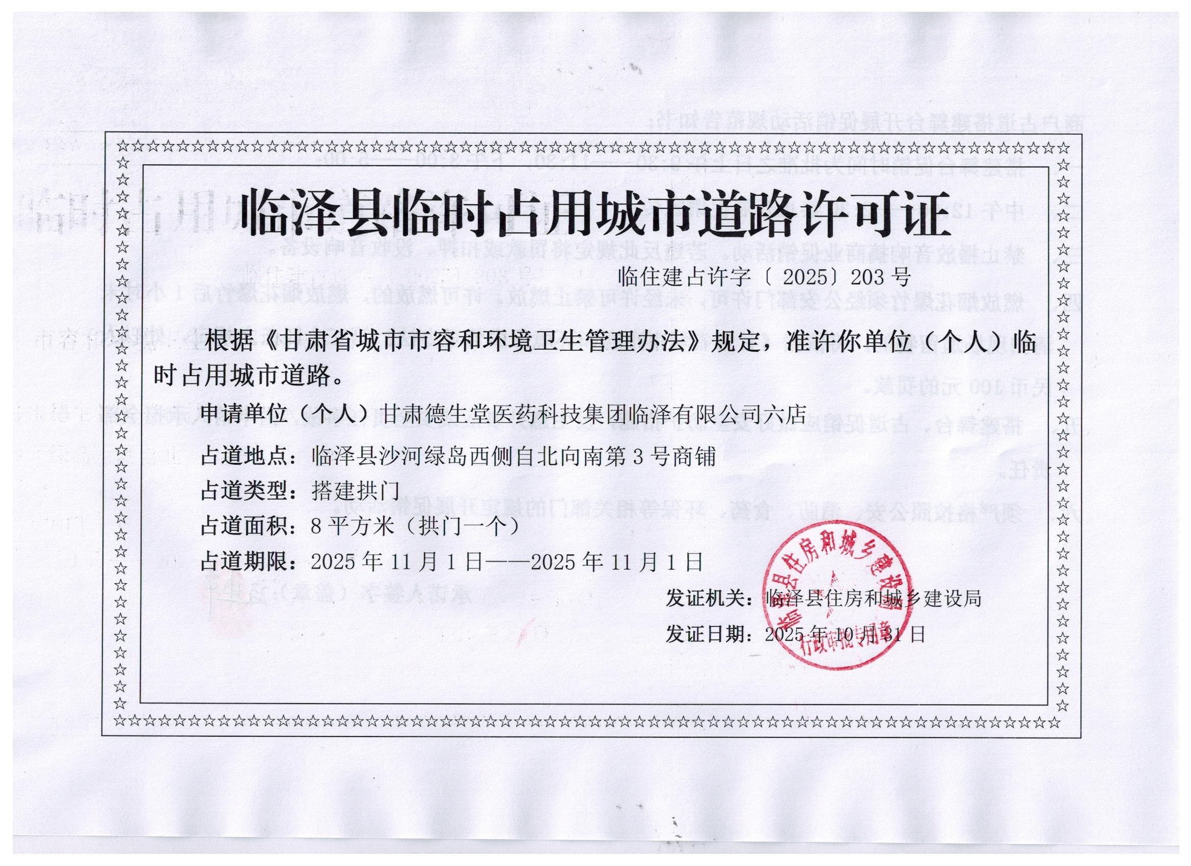 临泽县城管执法队对甘肃德生堂医药科技集团临泽有限公司六店占道的许可证